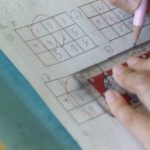 3年生は算数の練習問題です。定規をあてて表をきれいに書いています。