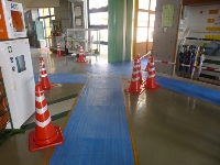 児童玄関にはブルーシートが敷かれ,子どもたちが安全に歩けるように