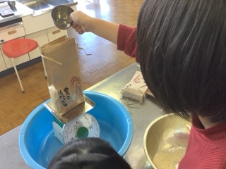 今日は、精米したてのお米を協力して1kgずつ袋詰めする作業に取り組みました。