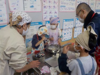 子どもたちは、ボランティアの方に手伝ってもらいながら、さつまいもを切ったり生地と混ぜたりしました。