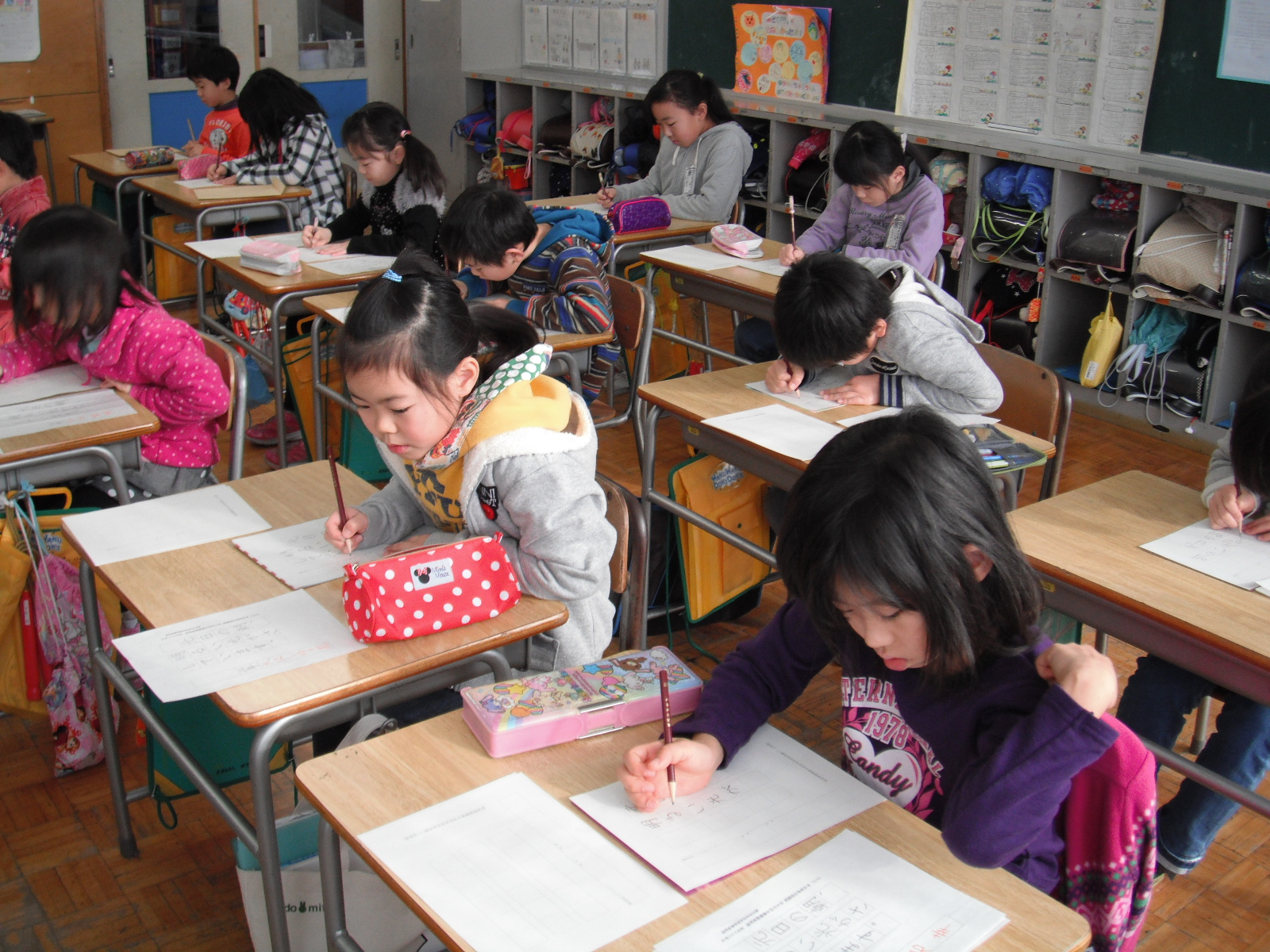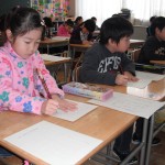 出来上がった作品は「校内書き初め展」として,教室廊下等に掲示されます。1/17(土)のフリー学習参観日の折にも,ぜひ,子どもたちの力作をご覧いただければと思います。