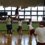 2018年7月10日 / 最終更新日 : 2018年7月10日 admin 東小news 7月10日(火)3年生PTA学年行事 3年生PTA学年行事は「親子deフィットボクス」 スポーツ道場KAGAYAKIから講師の先生をお招きし,ボクササイズを行いました。 腕を前に突き出すだけでなく,リズミカルに足の動きをつけます。 右に動いてパンチ,左に動いてパンチ!(ここまではうまくできる) 次に右・真ん中・左と,真ん中での1・2(ワンツー)のパンチが入ると・・・ 親子でリズミカルに動けるよう練習しました。 たくさん汗をかいたけど,ストレス発散できたようです。