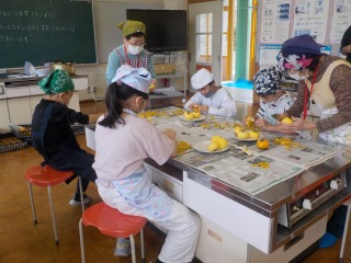2018年10月10日 / 最終更新日 : 2018年10月10日 admin 東小news 10月10日(水)干し柿 昨日用務員さんと,地域教育コーディネーター・ボランティアの皆様とで,学校にある柿の 木の柿をもぎました。今年は豊作で5箱分もいでも,まだ木の上にはたくさん実がついてい ました。 今日3・4時間目に6年生が毎年恒例の「干し柿づくり」を行いました。 1 柿の皮をむく。 2 柿ひもに柿を結びつける。 3 沸騰したお湯に30秒つける。 4 竿などにぶら下げて柿を干す。 秋の深まりとともに,干し柿が甘さを増していくことでしょう。 できあがりが楽しみです。